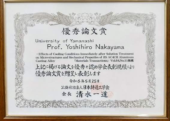 令和6年5月25日(土)、早稲田大学で開催された日本鋳造工学会第183回全国講演大会において、工学域の猿渡直洋助教、中山栄浩教授が優秀論文賞を受賞しました。