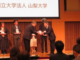 本学の奥田徹理事(教学担当)が同財団の宮永俊一理事長から目録を授与され、プログラム代表者の大槻隆司准教授(全学共通教育センター・全学共通教育企画室長)が事例発表を行いました。