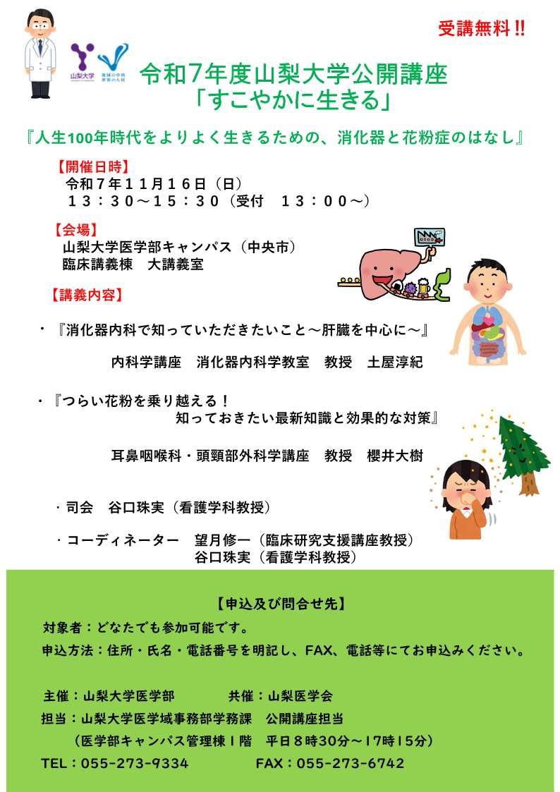 山梨大学公開講「『すこやかに生きる』人生100年時代をよりよく生きるための、消化器と花粉症のはなし」のご案内(11/16開催)