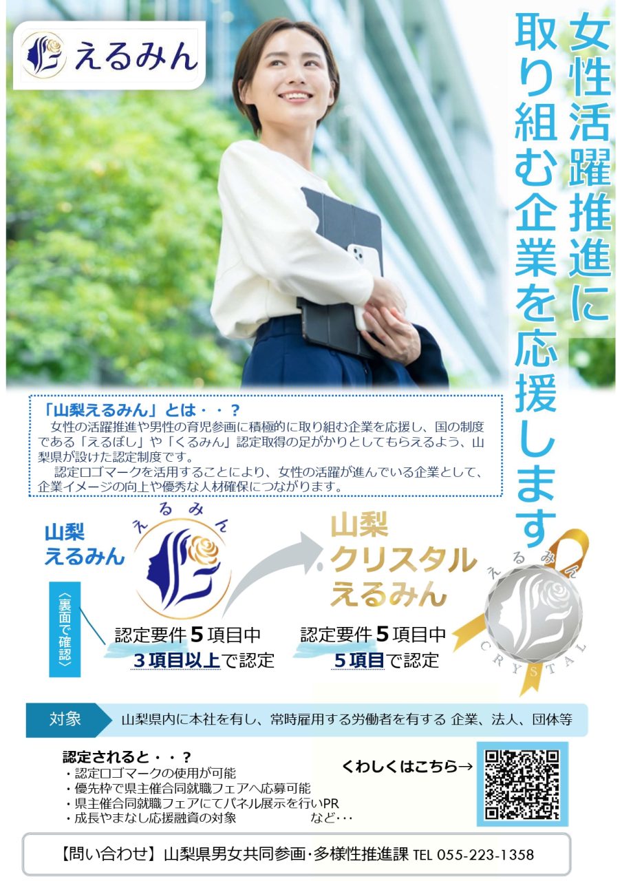 「山梨えるみん」は、女性の活躍推進や男性の育児参画に積極的に取り組む企業を応援し、