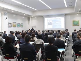 その後、丸山氏が「将来の社会・産業構造の変化を見据えた大学の理系転換の促進等について」と題して講演し、公立学校共済組合の取組や大学病院の経営状況、さらに将来の社会・産業構造の変化を踏まえた、大学の理系転換の促進について触れ、日本の教育と医療が直面する課題を挙げ、それらを乗り越えるためのビジョンについて語りました。
