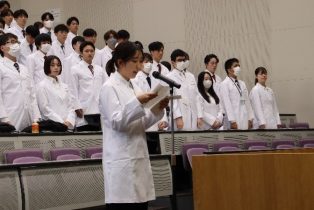 その後、各学生に「臨床実習生(医学)認定証」が授与され、学生を代表して佐々木凛芽さんが「臨床実習の場では学生という立場ではありながらも一人の医療従事者としての自覚と責任が求められます。何事にも謙虚、かつ積極的な姿勢で臨み、臨床実習で得られる全ての経験を学びに変え、将来の医療や社会に貢献していきます」と誓いの言葉を述べました。