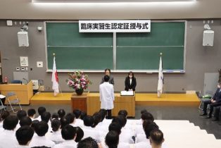 本授与式は、医学知識と総合的理解力を問う試験 CBT (Computer Based Testing) と、必要な基本的診療技能・医療者としての態度を問う客感的臨床能力試験 OSCE (ObjectiveStructured Clinical Examination) の 2 つの医学生共用試験に合格し、臨床実習に必要な知識・技能・態度を修得したことが認められた学生に「臨床実習生(医学)認定証」を授与するもので、本学ではこの資格を取得した学生が、4 年次の 1 月から 6 年次の 9 月まで、附属病院や多くの関連教育病院で臨床実習を行います。