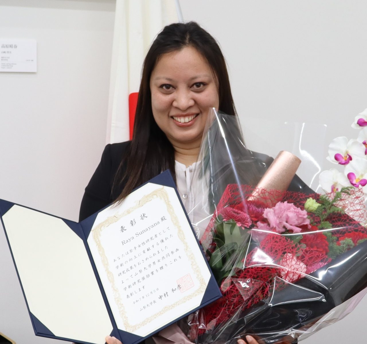 今年度は、学術上優れた研究業績を上げ、地域にも高い貢献をした教育学域の秋山麻実教授が「優秀賞」に、優れた研究成果が期待される若手研究者として、推薦当時大学院医工農学総合教育部工学専攻博士課程3年であったラヤ スナヤナさんが「奨励賞」に選ばれました。