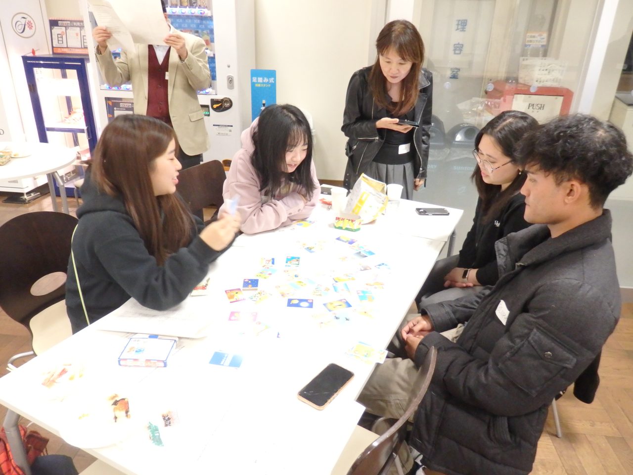 後期の交流会では、留学生による母国紹介、そして日本文化の発信として「かるた」を実施しました。今回使用したかるたは日本のことわざを題材としたもので、ゲームを楽しむだけでなく、本学部学生が外国人留学生にことわざの意味を説明したり、留学生が自国語の類似表現を紹介したりと、参加者全員が互いに学び合いながら交流を深める機会となりました。