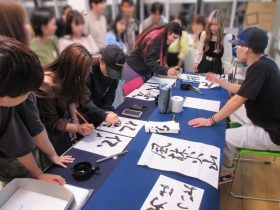 前期の交流会では、留学生による母国紹介、海外留学経験者によるルートヴィヒスブルク教育大学での長期留学の紹介、そして書道の実演が行われました。書道の実演では、言語教育を学ぶ学生たちが留学生に書道を披露し、留学生たちもお手本を見ながら熱心に書道体験に取り組む姿が見られました。