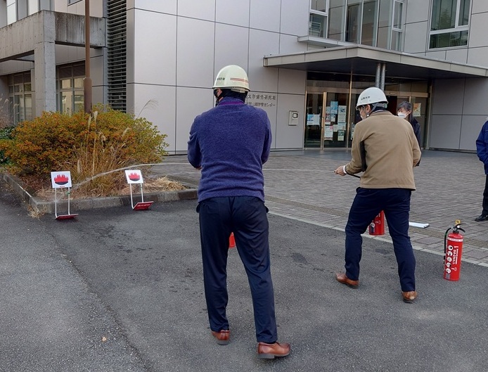 今回は、同キャンパスの建物(学生実験室)で火災が発生したことを想定した訓練を行いました。