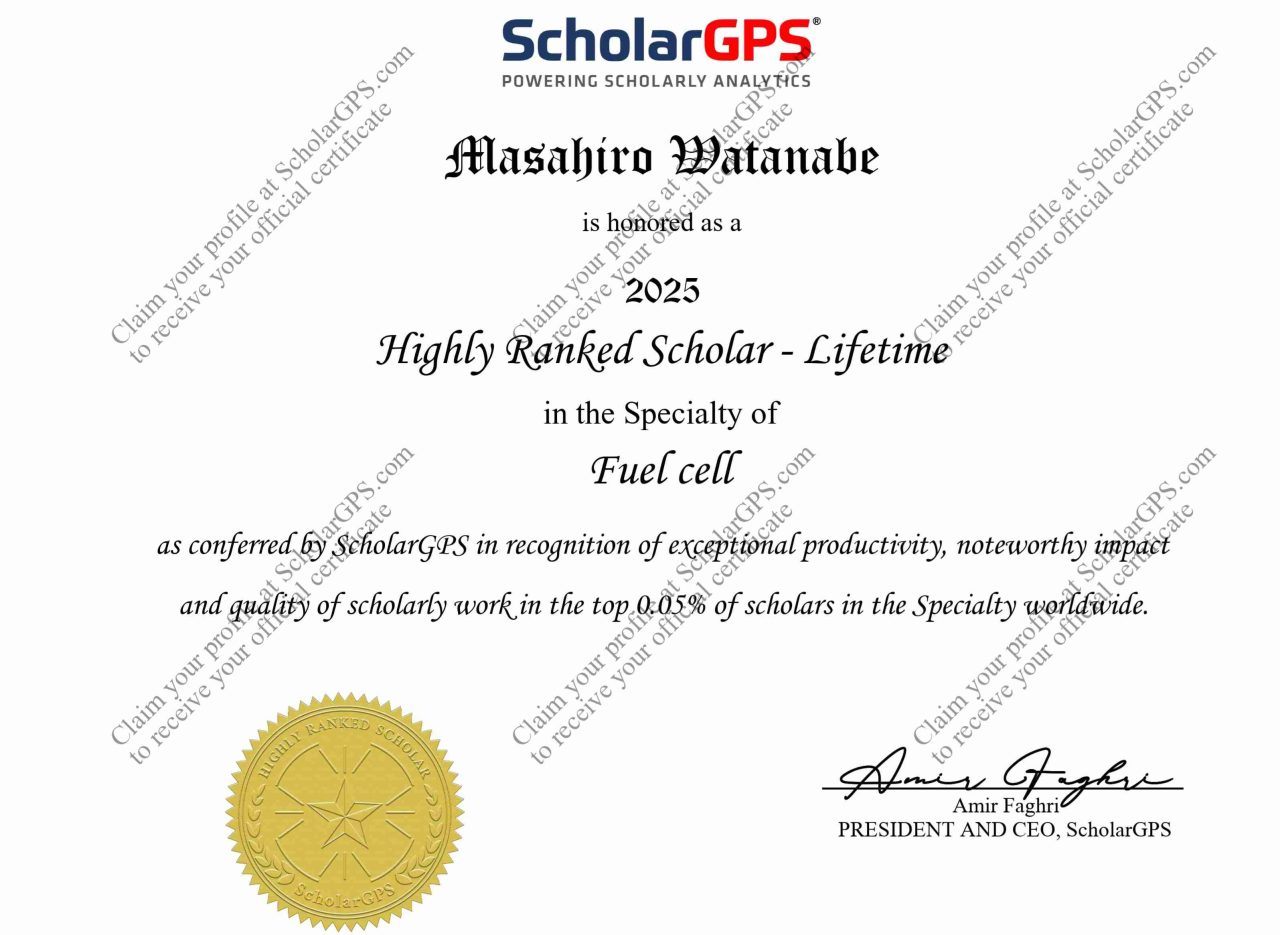 渡辺特命教授は、「化学エネルギー資源を高効率・無公害に電気エネルギーに変換する燃料電池研究を開始して、以来50有余年になります。この間、産官学との連携を通じ、出口を見据えた基礎的重要課題に一貫して取り組み、その成果を国際学術誌に発表してきました。初期から現在に至る論文が、世界の研究者・技術者に年間1000数百回引用され続けられていることが、今回のScholarGPSによるHighly Ranked Scholars™として認証されたもので、これは共に取組んだ歴代の同僚、学生さんに対する評価でもあり、喜びを分かち合いたいと思います。後継者の皆さんが新たに水電解も含め活発な研究成果報告を続けられており、GX化に向け世界の中心拠点の役割を果たしていかれることを期待しております」とコメントしています。