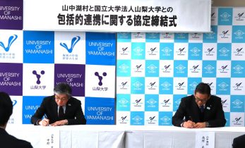 締結式では、高村正一郎山中湖村長と中村和彦学長による、協定書締結の署名が行われました。