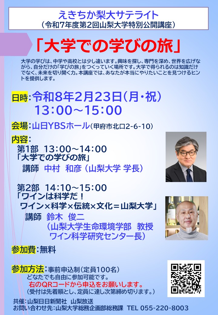 山梨大学では、下記のとおり特別公開講座「大学での学びの旅」を、山梨日日新聞社・山梨放送との共催により開催します。