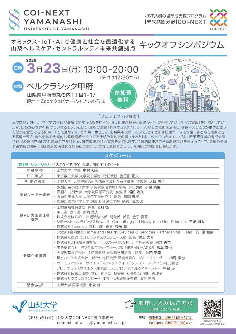 本学では、「オミックス・IoT・AIで健康と社会を最適化する山梨ヘルスケア・セントラルシティ未来共創拠点」のキックオフシンポジウムを開催いたします。