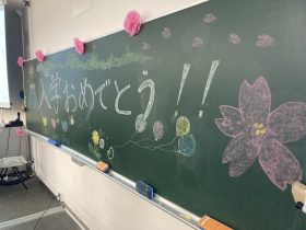 - 在学生が教室の黒板に描いた歓迎メッセージ