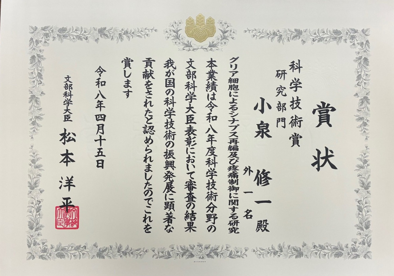 令和8年4月15日(水)、小泉修一医学域教授(医学域長)が令和8年度科学技術分野の文部科学大臣表彰科学技術賞(研究部門)を受賞し、文部科学省において表彰式が行われました。