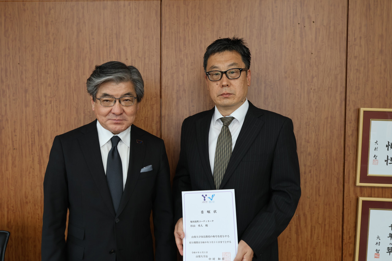令和8年4月1日(水)、甲府キャンパスにおいて、中村和彦学長が新たに「地域連携コーディネータ」となった山梨中央銀行の杉山勇人氏に客員教授称号を授与しました。