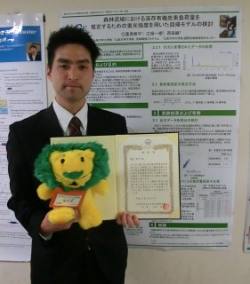 工学部土木環境工学科環境共生コース4年の蓮見修平さん(指導教員:西田 継准教授)が、平成27年3月16日(月)~18日(水)に金沢大学で開催された第49回日本水環境学会年会において、年会学生ポスター発表賞(ライオン賞)を受賞しました。
