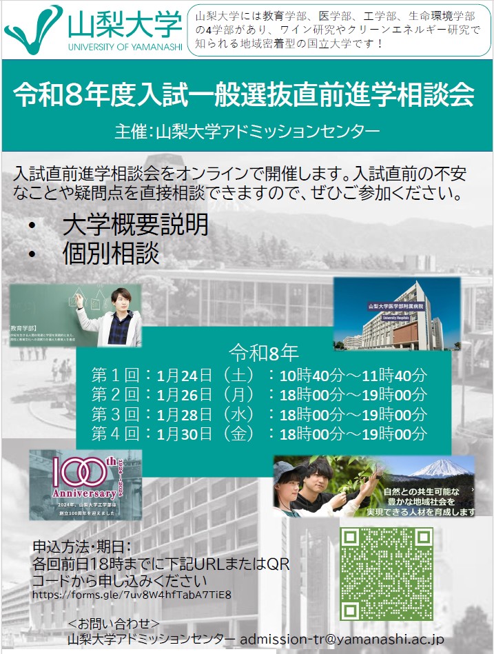 山梨大学アドミッションセンターでは、入試直前の不安なことや疑問点を少しでも解消できるよう、入試直前進学相談会をオンラインにて開催します。