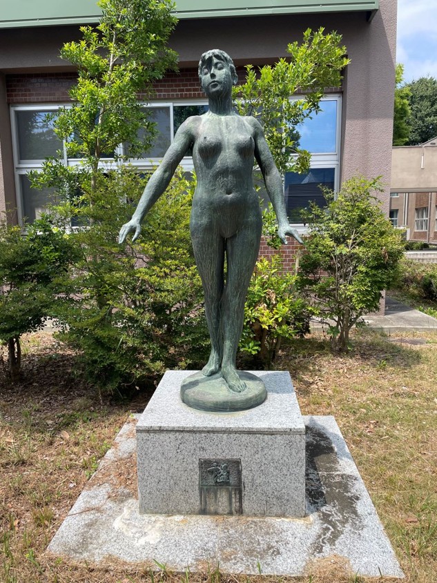 校舎ファサードの一部を、あづま屋として残したもの。屋根形状などは変えているが、特徴的な柱は当時のまま残っている。(左)